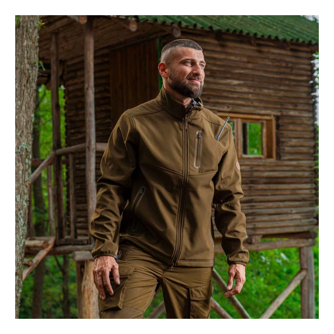 The Chameleon FEAE Olive Softshell Jacket is a premium hunting jacket made from elastic soft shell fabric with Teflon™ DWR coating, offering water repellency, durability and complete freedom of movement. Built from 100% silent fabric in olive color, it remains undetectable in nature while providing comfort, weather protection and mobility. FEAE ensures year‑round thermal comfort, functioning as an outer layer in transitional seasons or a mid‑layer in harsher conditions. The stretchable soft shell fabric is durable, resistant to wear and frequent washing, making it ideal for hunting, fishing, hiking and active everyday use. The adjustable waist and three functional pockets (two warm hand pockets and one upper radio pocket) enhance practicality. The jacket features taped SBS® zippers, an external antenna exit and an internal headphone channel — essential details for the modern hunter.