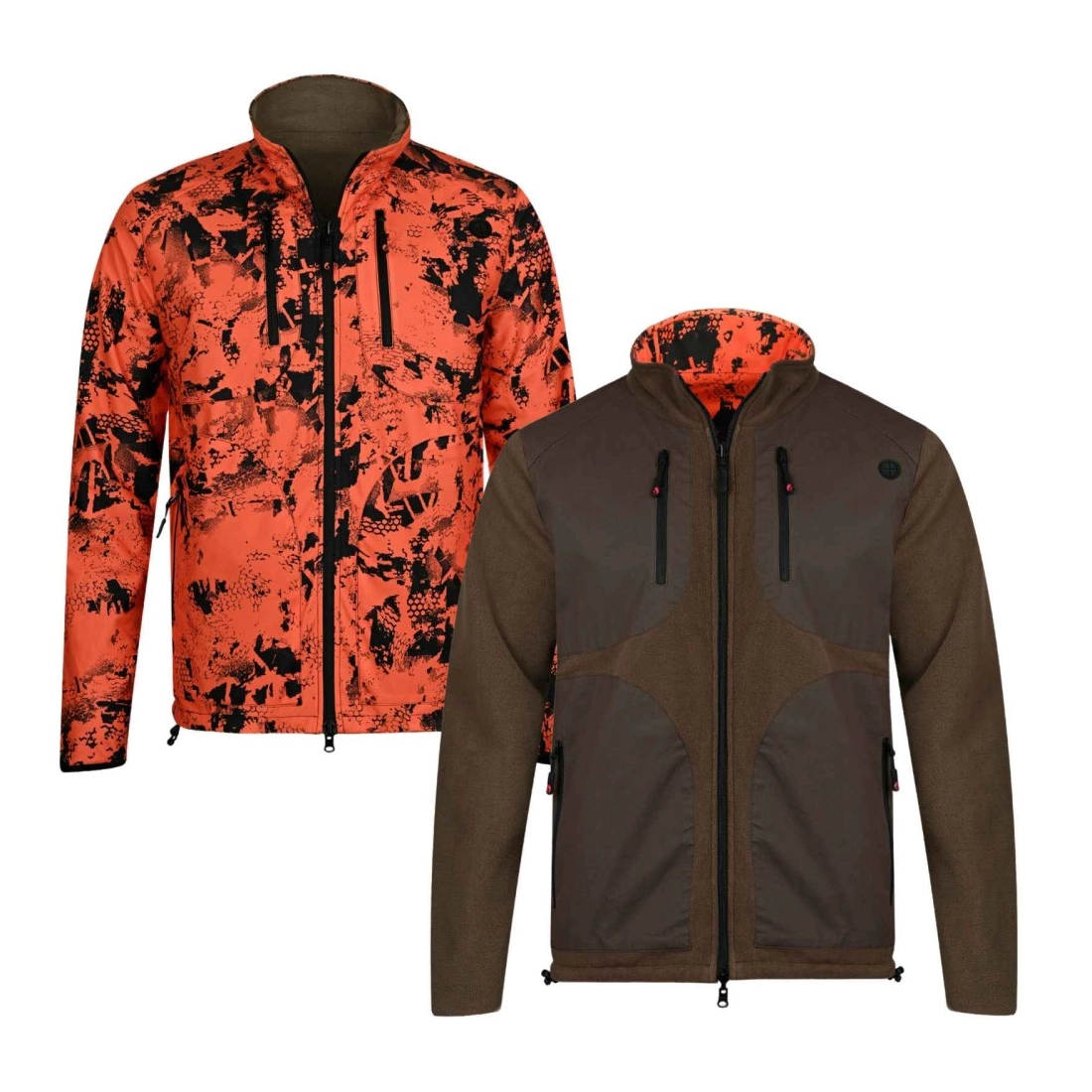 The Chameleon Damaran Brown/Hi‑Vis Reversible Fleece Jacket is one of the most preferred all‑season hunting jackets, offering both visibility and natural concealment. One side features Hi‑Vis Chameleon Camo® for safety in open terrain, while the reverse side in tactical brown blends seamlessly into forest and mixed environments. Made from compression‑resistant aerodynamic microfleece with a Windblock membrane and Teflon™ coating, it repels water and dirt while providing strong protection against cold winds, light rain and snow. It ensures thermal comfort even in dynamic weather conditions. The jacket includes two lower and two upper pockets, headphone outlets and a waterproof antenna port on the left chest pocket. High‑quality SBS® dual‑direction zippers ensure smooth operation, while adjustable waist cinching enhances fit and functionality. Designed for year‑round use — as an outer jacket in mild weather or as a mid‑layer during harsh winter conditions.